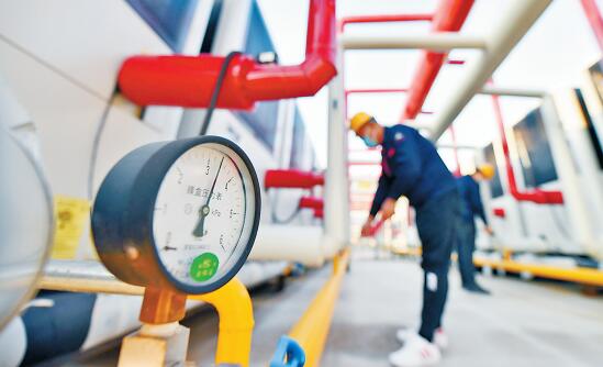 在廊坊市南城熱力有限公司陽光供熱站,供熱工人查看燃?xì)馕帐娇諝鉄嵩幢霉艿浪h(huán)系統(tǒng)。 記者 鄭晨子 攝