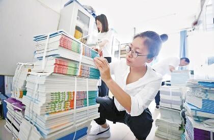 8月30日,大北尹小學(xué)教師在整理新課本。 記者 賈珺 攝