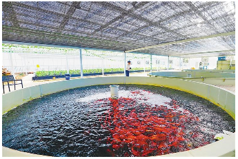 近日,永清縣龍虎莊鄉(xiāng)的興晟農(nóng)業(yè)研究院“魚菜共生”循環(huán)養(yǎng)殖基地內(nèi)一派春意盎然情景?;卮笈飪?nèi),3個(gè)圓形魚池并排羅列,池里的各類觀賞魚、中華鱘、清江魚等活力十足。通過循環(huán)過濾系統(tǒng)進(jìn)行水培的生菜、芹菜、韭菜、西蘭花、香蔥、甘藍(lán)等蔬菜郁郁蔥蔥,長勢喜人。