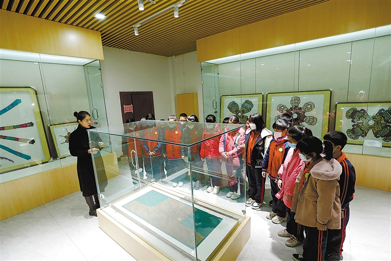 傳統(tǒng)刺繡技藝縣級傳承人左金歡為學生介紹中國傳統(tǒng)服飾。通訊員 龐趁友 記者 劉磊 攝