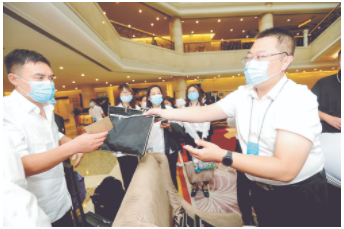 8月15日,國際飯店A座一樓大廳內(nèi),市第七次黨代會代表報到并領(lǐng)取有關(guān)資料。本報記者 陳童 攝