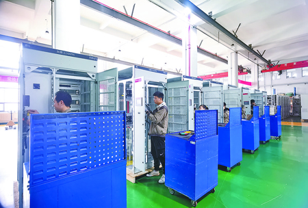 英博電氣裝配車間內(nèi),生產(chǎn)人員正進(jìn)行成套產(chǎn)品裝配工作。