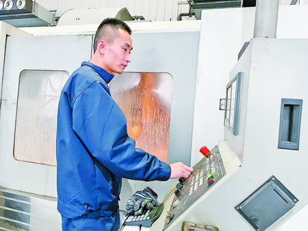 圖為工作人員正在操作設(shè)備加工鉆頭主軸。