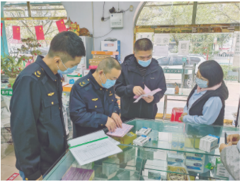 圖為執(zhí)法人員在藥店進行執(zhí)法檢查。