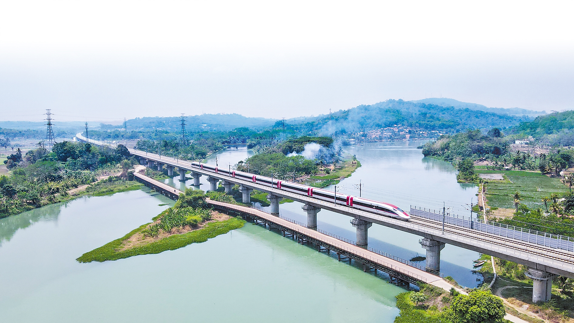 這是在印度尼西亞普哇加達拍攝的一列行駛中的雅萬高鐵高速動車組(9月30日攝,無人機照片)。新華社記者 徐 欽攝