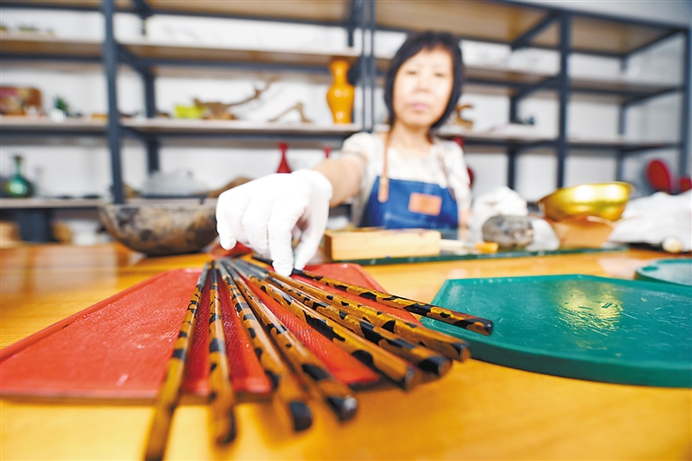 在村鎮(zhèn)的一個小型工作室,河北省級非遺項目金漆彩繪髹飾技藝傳承人劉秀娟正在仔細勾勒漆器上的圖案?!白鳛橐环N古老的漆器工藝,金漆彩繪髹飾技藝是以黑、黃、紅等漆胎為底色,從而展現(xiàn)作品的光彩。我在保持宮廷傳統(tǒng)工藝技法和藝術(shù)風格的同時,還將中國畫中的滃染、點暈、皴法等融入其中?!眲⑿憔暌贿吋氈鹿蠢展P下的圖案一邊說。
