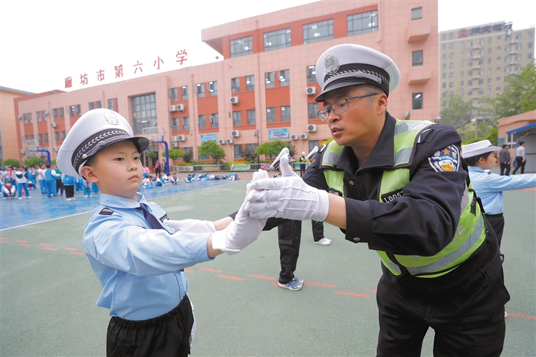 市交警一大隊民警在教授廊坊市第六小學“少年交警隊”成員交警手勢指揮動作。