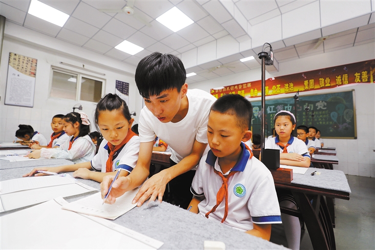 廊坊市第六小學5G+書法教室內(nèi),老師在教授學生們硬筆書法的書寫規(guī)范。
