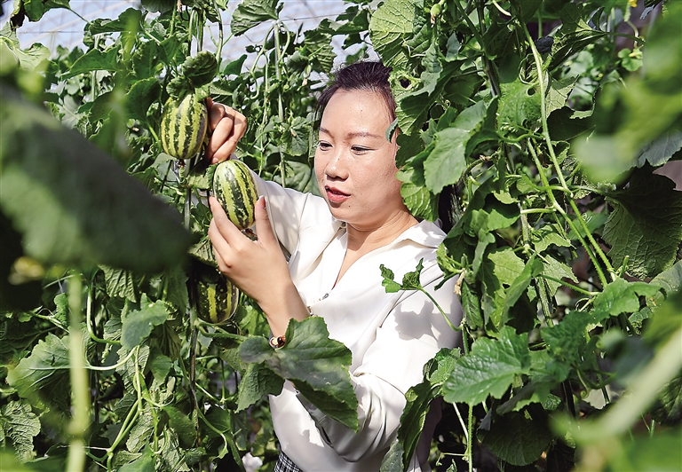 南趙扶鎮(zhèn)一家農(nóng)業(yè)示范基地的設(shè)施大棚內(nèi),農(nóng)民在分揀甜瓜。