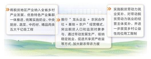 發(fā)揮主導(dǎo)產(chǎn)業(yè)帶動作用。將脫貧地區(qū)產(chǎn)業(yè)納入全省鄉(xiāng)村產(chǎn)業(yè)發(fā)展、優(yōu)勢特色產(chǎn)業(yè)集群一體推進(jìn),統(tǒng)籌實(shí)施奶業(yè)、中央廚房、蔬菜、中藥材、精品肉類五大千億級工程,創(chuàng)建一批農(nóng)業(yè)產(chǎn)業(yè)強(qiáng)鎮(zhèn)、現(xiàn)代農(nóng)業(yè)產(chǎn)業(yè)園和特色農(nóng)產(chǎn)品優(yōu)勢區(qū),加快發(fā)展鄉(xiāng)村旅游、農(nóng)村電商、幫扶車間等特色富民產(chǎn)業(yè),推動脫貧地區(qū)特色產(chǎn)業(yè)轉(zhuǎn)型升級,帶動脫貧人口和監(jiān)測對象參與全產(chǎn)業(yè)鏈發(fā)展,多渠道增加脫貧群眾收入。