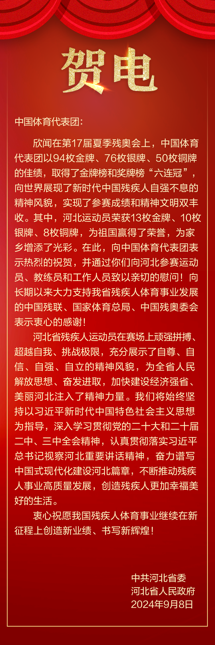 河北省委省政府向中國(guó)體育代表團(tuán)致賀電