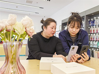 2月12日,在廣陽區(qū)永通通信手機(jī)城內(nèi),銷售人員正在為顧客講解手機(jī)產(chǎn)品。