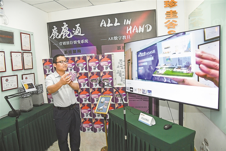 技術(shù)人員正在展示突破多維映射跟蹤技術(shù)全方位AR體驗(yàn)。 記者 李泳辰 攝