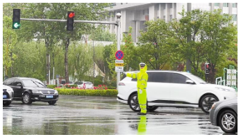 圖為交警在雨中執(zhí)勤。本報(bào)記者 陳正 攝