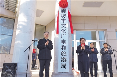 圖為市領(lǐng)導(dǎo)為新成立的廊坊市文化廣電和旅游局揭牌現(xiàn)場(chǎng)。記者 陳童 攝