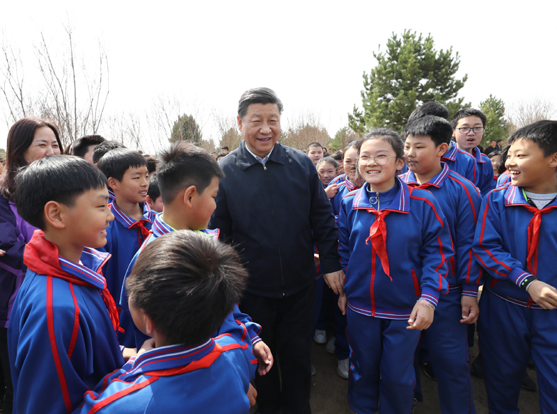4月8日,黨和國家領(lǐng)導(dǎo)人習(xí)近平、栗戰(zhàn)書、汪洋、王滬寧、趙樂際、韓正、王岐山等來到北京市通州區(qū)永順鎮(zhèn)參加首都義務(wù)植樹活動。這是習(xí)近平同少先隊員在一起。新華社記者 鞠鵬 攝