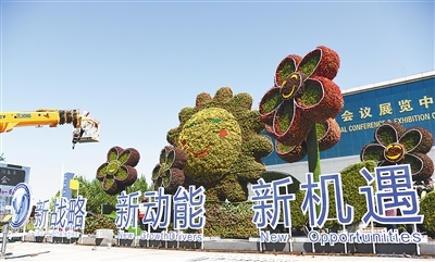 在會展中心B館南廣場,園林工人正在安裝一座巨型立體花壇,綠色花瓣襯托中心笑臉,寓意笑迎八方來客,“新戰(zhàn)略、新動能、新機遇”的大會主題格外醒目。