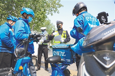 在市區(qū)廣陽(yáng)道與裕華路交口的燕青崗,交警加大現(xiàn)場(chǎng)執(zhí)法和勸導(dǎo)力度,嚴(yán)管不按規(guī)定通行的行為。充分借助交通技術(shù)監(jiān)控等取證設(shè)備,加大對(duì)非機(jī)動(dòng)車闖紅燈等違法行為的查糾力度,提升查處效能,擴(kuò)大震懾作用。同時(shí),交警還現(xiàn)場(chǎng)向外賣小哥和快遞小哥宣傳交通法規(guī)相關(guān)知識(shí)以及處罰辦法。