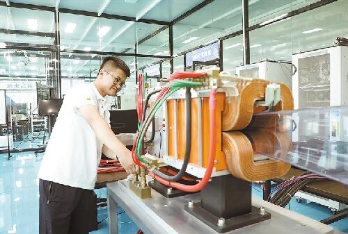 ③7月21日,新里程醫(yī)療(廊坊臨空自貿(mào)區(qū))集團有限公司的技術(shù)人員正在調(diào)試掃描治療頭。