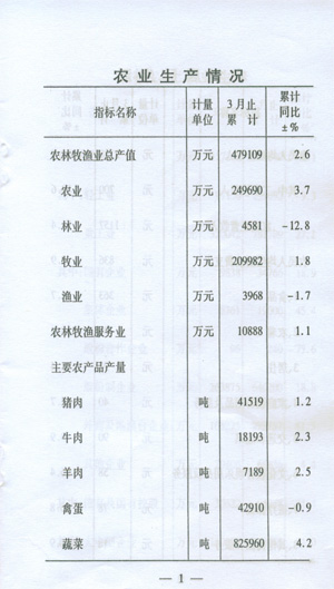 ——農(nóng)業(yè)穩(wěn)定增長。全市完成農(nóng)林牧漁業(yè)總產(chǎn)值47.9億元,增長2.6%,與上年同期相比增速回落了1.0個百分點(diǎn);主要農(nóng)產(chǎn)品產(chǎn)量除禽蛋增速下降外,其余均增長,蔬菜增長最快為4.2%。