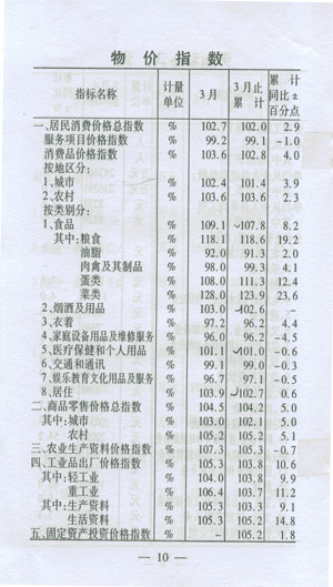 ——物價小幅上揚(yáng)。全市居民消費(fèi)價格總指數(shù)102.O,商品零售價格總指數(shù)為104.2,與上年同期相比,漲幅分別提高2.9個和5.0個百分點(diǎn)。農(nóng)業(yè)生產(chǎn)資料價格上漲5.3%,工業(yè)品出廠價格上漲3.8%。