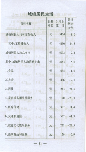 ——收入穩(wěn)步增加。一季度,城鎮(zhèn)居民人均可支配收入5424,同比增加289元,增長8.0%;在崗職工平均工資8229元,同比增加1196元,增長17.0%;初步預(yù)測農(nóng)民人均現(xiàn)金收入達(dá)到2138元,同比增加219元,增長11.4%。