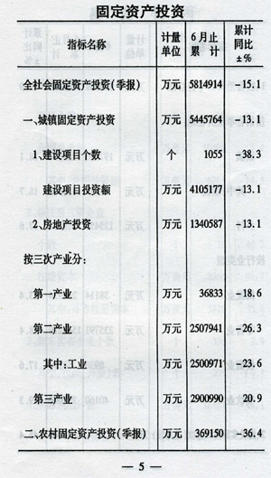 ——投資增速下降。全社會(huì)固定資產(chǎn)投資完成581.5億元,同比下降15.1%,其中城鎮(zhèn)固定資產(chǎn)投資完成544.6億元,同比下降13.1%。建設(shè)項(xiàng)目投資和房地產(chǎn)投資分別完成410.5億元和134.1億元,均下降13.1%。