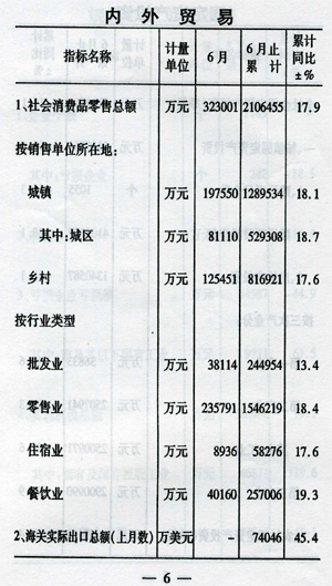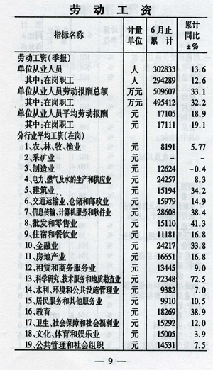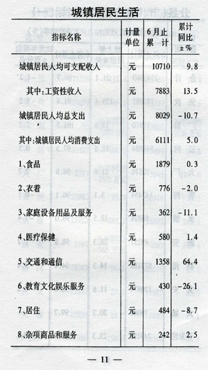 ——居民收入持續(xù)增加。據(jù)抽樣調(diào)查統(tǒng)計(jì),上半年,全市城鎮(zhèn)居民人均可支配收入10710元,同比增長(zhǎng)9.8%;城鎮(zhèn)在崗職工平均工資17111元,同比增長(zhǎng)19.1%;預(yù)計(jì)農(nóng)民人均現(xiàn)金收入4827元,同比增長(zhǎng)12.4%。