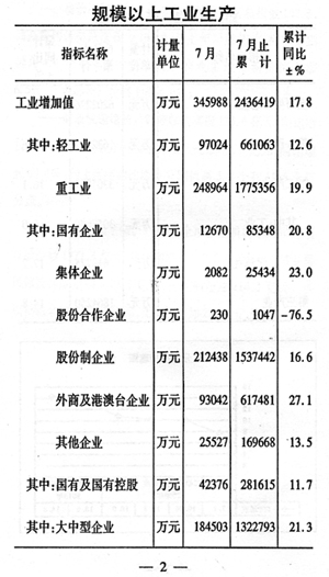 ——工業(yè)較快增長。規(guī)模以上工業(yè)增加值完成243.6億元,同比增長17.8%,與上半年相比增速回落了3.3個百分點。其中輕重工業(yè)分別增長12.6%和19.9%。