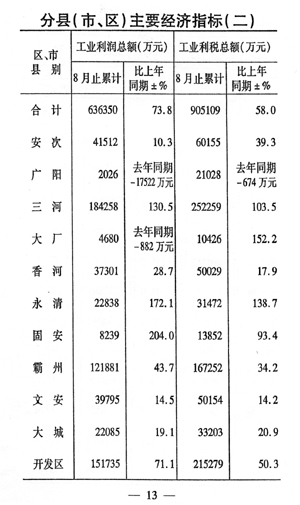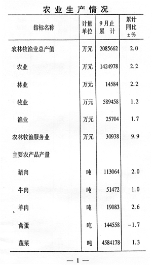 ——農(nóng)業(yè)全面增長。全市完成農(nóng)林牧漁業(yè)總產(chǎn)值208.6億元,實(shí)現(xiàn)增加值111.5億元,均增長2.0%,增速與上半年相比分別加快0.6個和0.4個百分點(diǎn),與上年同期相比分別回落1.3個和l.4個百分點(diǎn)。分行業(yè)看農(nóng)林牧漁服務(wù)業(yè)增長最快為9.9%。