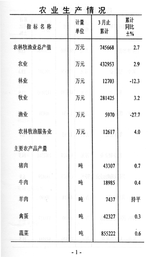 ——物價相對穩(wěn)定。一季度全市居民消費價格總指數(shù)(CPI)103.5,同比回落1.7個百分點,商品零售價格總指數(shù)104.2,同比回落0.1個百分點。農(nóng)業(yè)生產(chǎn)資料價格上漲6.2%,工業(yè)生產(chǎn)者出廠價格下降3.9%。