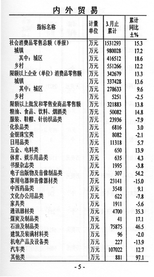 ——消費增長趨緩。全社會消費品零售總額實現(xiàn)153.1億元,增長15.3%,與上年同期相比增速回落1.0個百分點。其中限額以上社會消費品零售總額完成34.3億元,增長13.3%。