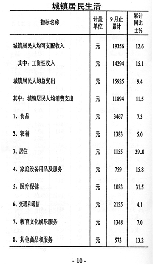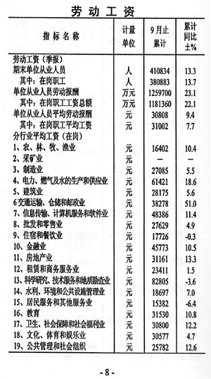 ——城鄉(xiāng)收入增加。城鎮(zhèn)居民人均可支配收入19356元,同比增加2159元,增長12.6%,與上年同期相比增速提高0.4個百分點;在崗職工平均工資31002元,同比增加2213元,增長7.7%,與上年同期相比回落6.4個百分點;農民人均現金收入預計11394元,同比增加1522元,增長15.8%。