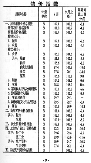 一一物價穩(wěn)中有落。全市居民消費價格指數102.8,與上年同期相比漲幅回落3.1個百分點,商品零售價格指數103.O,同比回落2.4個百分點。農業(yè)生產資料價格指數105.7,同比回落2.8個百分點,工業(yè)生產者出場價格指數95.O,同比回落10.5個百分點。