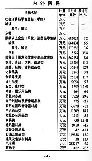 ——消費(fèi)略有回升。限額以上企業(yè)消費(fèi)品零售額實(shí)現(xiàn)68.3億元,增長(zhǎng)7.2%,與1-4月份相比提高0.5個(gè)百分點(diǎn),與上年同期相比回落5.7個(gè)百分點(diǎn)。其中,城鎮(zhèn)實(shí)現(xiàn)消費(fèi)品零售額66.5億元,增長(zhǎng)6.5%;鄉(xiāng)村實(shí)現(xiàn)1.8億元,增長(zhǎng)35.8%。