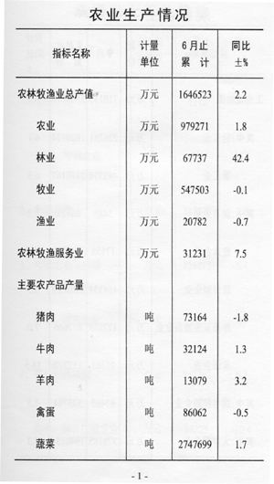 ——農(nóng)業(yè)生產(chǎn)平穩(wěn)。全市完成農(nóng)林牧漁業(yè)總產(chǎn)值164.7億元,增長2.2%,與一季度相比回落0.9個百分點。分行業(yè)看,林業(yè)增長最快為42.4%。分種類看,蔬菜274.8萬噸,增長1.7%;牛羊肉產(chǎn)量分別為3.2萬噸和1.3萬噸,分別增長1.3%和3.2%;豬肉、禽蛋產(chǎn)量分別為7.3萬噸和8.6萬噸,分別下降1.8%和0.5%。
