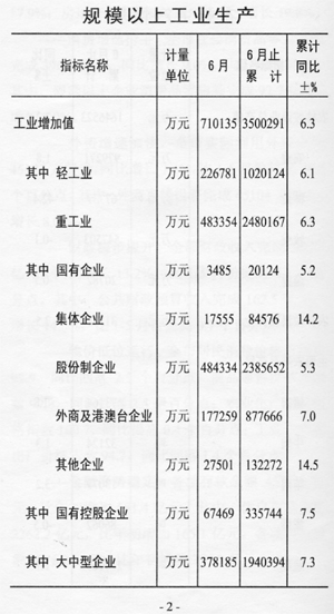 ——工業(yè)持續(xù)回升。全市規(guī)模以上工業(yè)增加值完成350.0億元,同比增長6.3%,比一季度提高0.3個百分點,比1-5月份提高0.1個百分點。全市規(guī)模以上工業(yè)33個行業(yè)大類中,24個行業(yè)增加值同比增長。