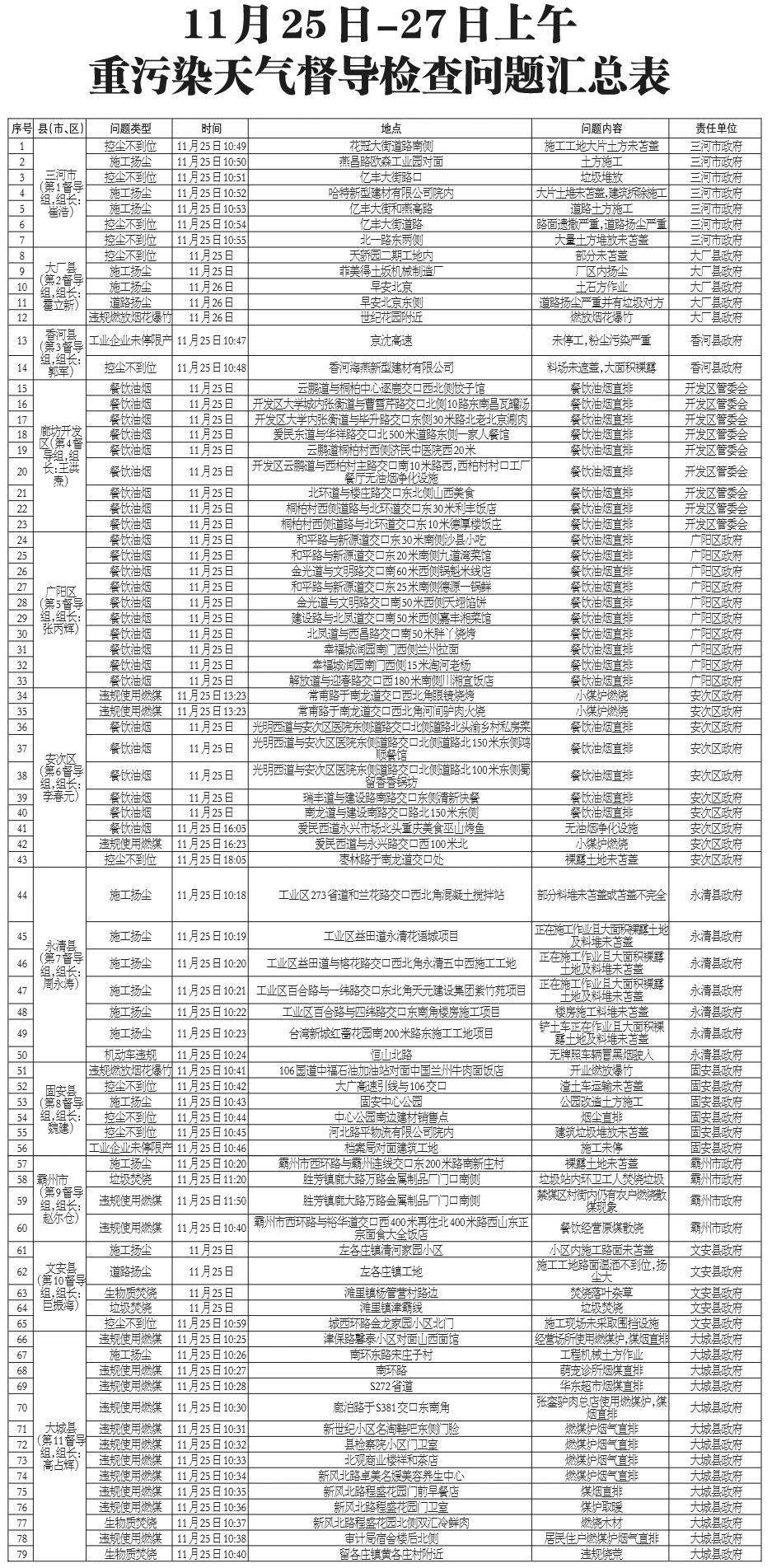 會(huì)議通報(bào),11月25-26日發(fā)現(xiàn)問(wèn)題10類79個(gè),其中餐飲油煙問(wèn)題25個(gè),道路揚(yáng)塵問(wèn)題2個(gè),工業(yè)企業(yè)未停限產(chǎn)問(wèn)題2個(gè),機(jī)動(dòng)車違規(guī)問(wèn)題1個(gè),控塵不到位問(wèn)題11個(gè),垃圾焚燒問(wèn)題2個(gè),生物質(zhì)焚燒問(wèn)題2個(gè),施工揚(yáng)塵問(wèn)題15個(gè),違規(guī)燃放煙花爆竹問(wèn)題2個(gè),違規(guī)使用燃煤?jiǎn)栴}17個(gè)。