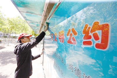 志愿者在擦拭社區(qū)公告欄。 記者 陳童 攝