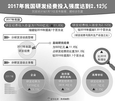 “2017年,我國(guó)研發(fā)經(jīng)費(fèi)投入強(qiáng)度達(dá)到2.12%的新高度。這是一個(gè)非常好的指標(biāo),它是在GDP增長(zhǎng)6.9%的基礎(chǔ)上實(shí)現(xiàn)的,在分母較高增長(zhǎng)的前提下實(shí)現(xiàn)的高增長(zhǎng),說(shuō)明我國(guó)建設(shè)創(chuàng)新型國(guó)家在加速?!眹?guó)家發(fā)改委學(xué)術(shù)委員會(huì)研究員張燕生在接受本報(bào)記者采訪時(shí)說(shuō)。