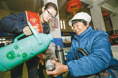廊運(yùn)集團(tuán)志愿服務(wù)隊(duì)一名志愿者正在為年長(zhǎng)旅客倒熱水。 記者 賈珺 攝