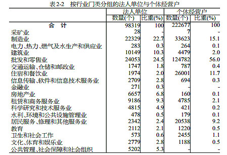在法人單位從業(yè)人員中,位居前三位的行業(yè)是:制造業(yè)40.0萬(wàn)人,占32.3%;建筑業(yè)15.0萬(wàn)人,占12.1%;批發(fā)和零售業(yè)13.2萬(wàn)人,占10.6%。在個(gè)體經(jīng)營(yíng)戶從業(yè)人員中,位居前三位的行業(yè)是:批發(fā)和零售業(yè)35.9萬(wàn)人,占17.5%;制造業(yè)13.8萬(wàn)人,占5.5%;住宿和餐飲業(yè)9.4萬(wàn)人,占4.9%(詳見(jiàn)表2-5)。