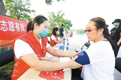 河北中石油中心醫(yī)院青年志愿者在市文化公園為市民測(cè)量血壓。記者 陳童 攝