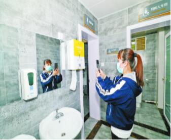 市區(qū)廣匯園公共衛(wèi)生間內(nèi),市民通過手機掃碼,利用免費取紙機取紙。 記者 賈珺 攝