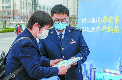 工作人員向群眾宣傳減稅降費(fèi)政策。
