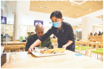 圖為廣陽區(qū)丹鳳社區(qū)“長者食堂”工作人員正在給老人上菜。 通訊員 付瑞琪 記者 王滿鳳 攝