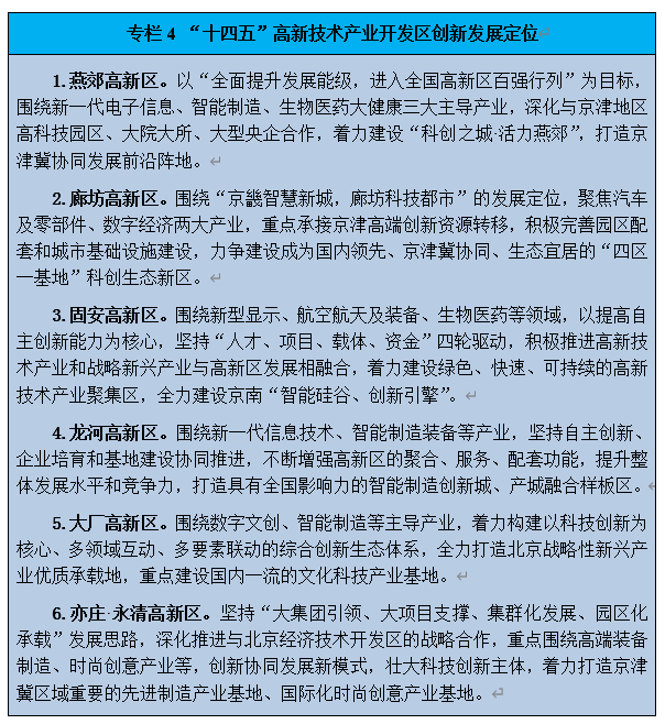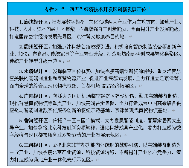 (一)推進(jìn)經(jīng)開(kāi)區(qū)提檔升級(jí)。支持廊坊經(jīng)開(kāi)區(qū)晉位升級(jí),著力培育戰(zhàn)略性新興產(chǎn)業(yè)集群,發(fā)展高水平開(kāi)放型經(jīng)濟(jì),“十四五”時(shí)期進(jìn)入全國(guó)經(jīng)開(kāi)區(qū)前30名,邁入國(guó)家級(jí)經(jīng)開(kāi)區(qū)第一方陣。支持霸州、永清、廣陽(yáng)、香河、三河、大城、文安等省級(jí)經(jīng)開(kāi)區(qū)加大招商引資力度,完善強(qiáng)化特色產(chǎn)業(yè)上下游鏈條,提升科技創(chuàng)新資源集聚度,不斷提升園區(qū)發(fā)展水平。