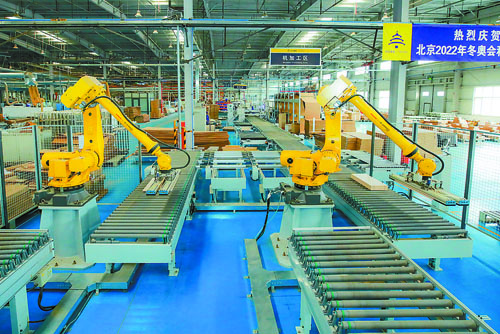 圖為該公司數(shù)智化生產(chǎn)線上,自動化機(jī)械臂正在生產(chǎn)板材家具。