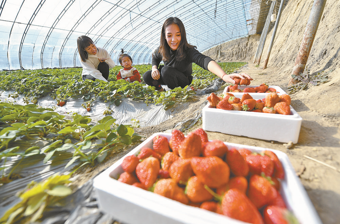 圖為在文安縣興隆宮鎮(zhèn)新騰農(nóng)業(yè)合作社草莓采摘園,游客正在體驗采摘樂趣。