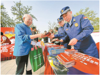 圖為志愿者向群眾發(fā)放消防安全手冊(cè),講解消防安全知識(shí)。 記者 楊雅淇 攝